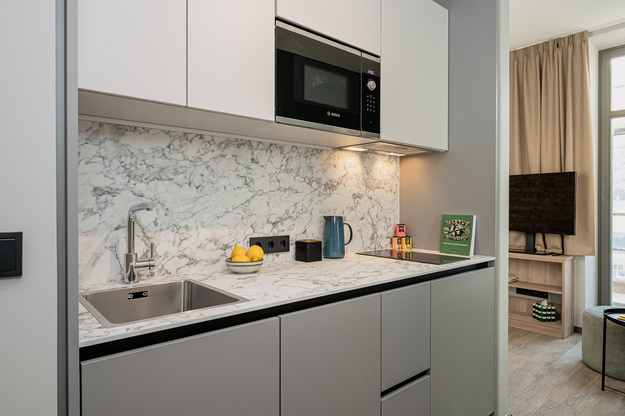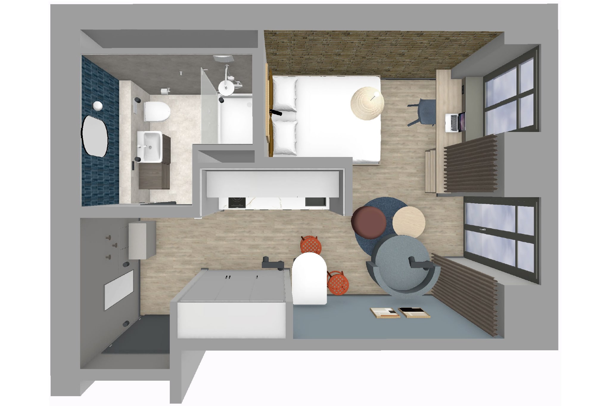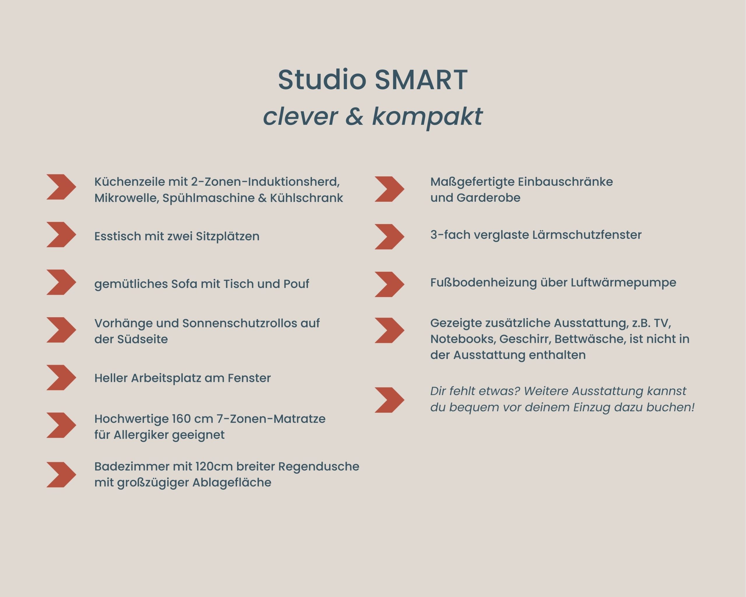 Clever durchdacht, perfekt genutzt: Das Studio SMART bietet dir dank durchdachter Aufteilung genau den Raum, den du brauchst – Schlafen, Arbeiten, Kochen und Wohnen in einem Raum – ohne Kompromisse.