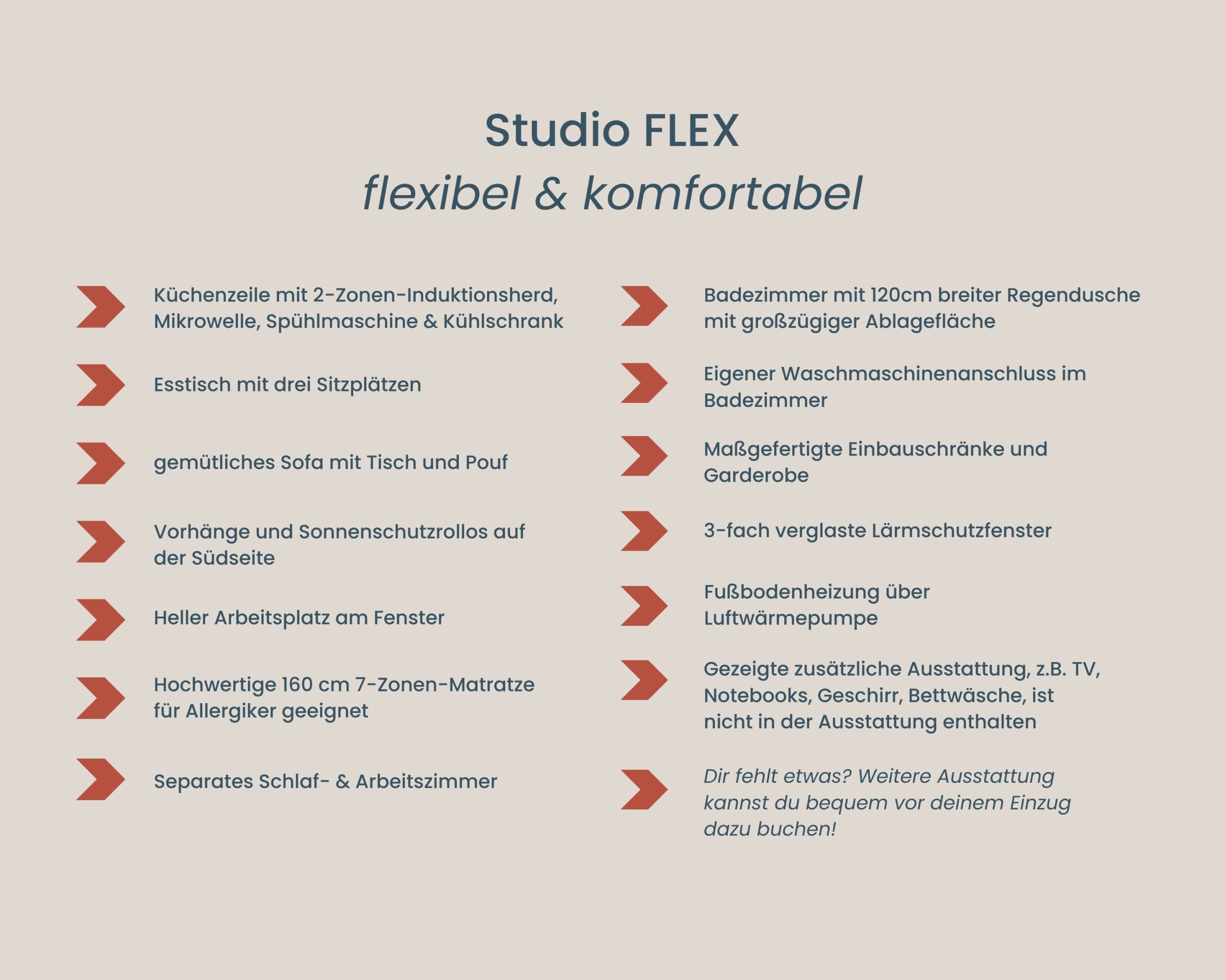 Ein separates Arbeits- und Schlafzimmer sowie ein großzügiger Wohnbereich machen das Studio FLEX zur idealen Wahl für alle, die flexibel und komfortabel wohnen und arbeiten möchten.