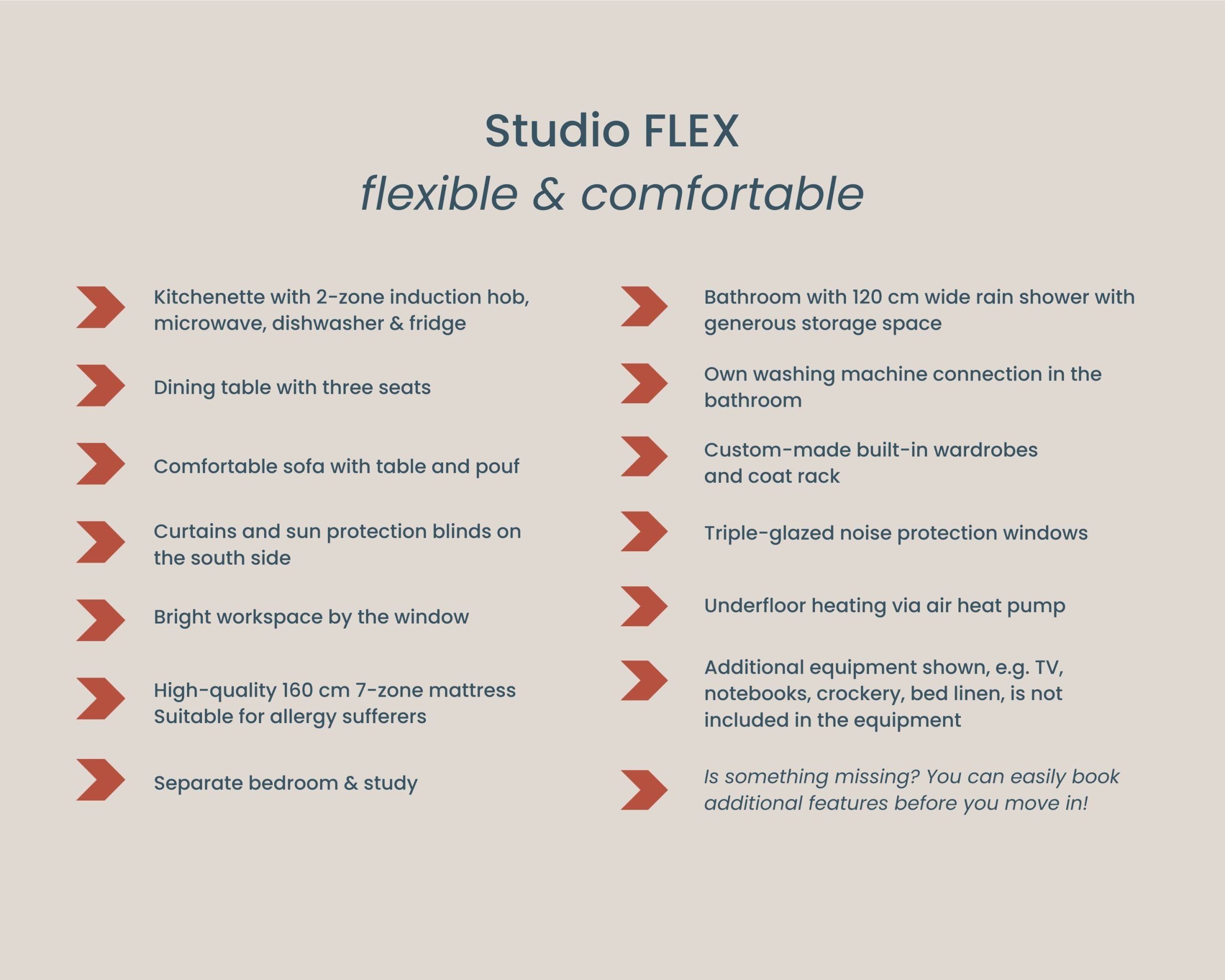 A separate work and bedroom as well as a spacious living area make the Studio FLEX the ideal choice for anyone who wants to live and work flexibly and comfortably.