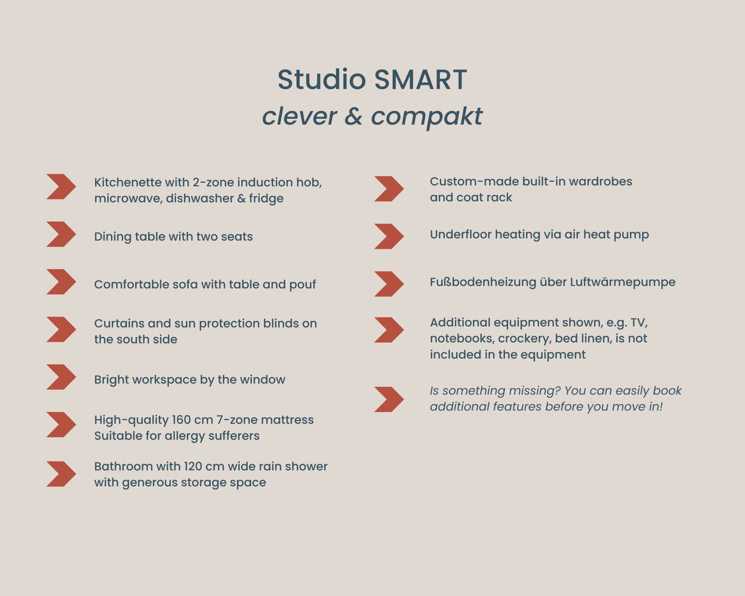 Cleverly thought out, perfectly used: Thanks to its well thought-out layout, the SMART studio offers you exactly the space you need – sleeping, working, cooking and living in one room – without compromise.